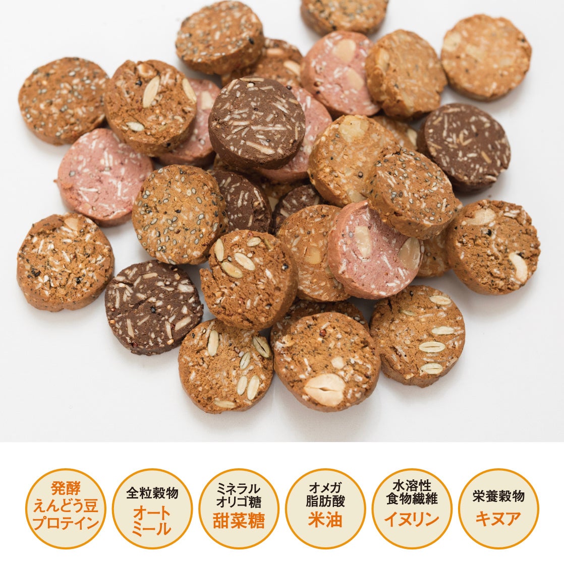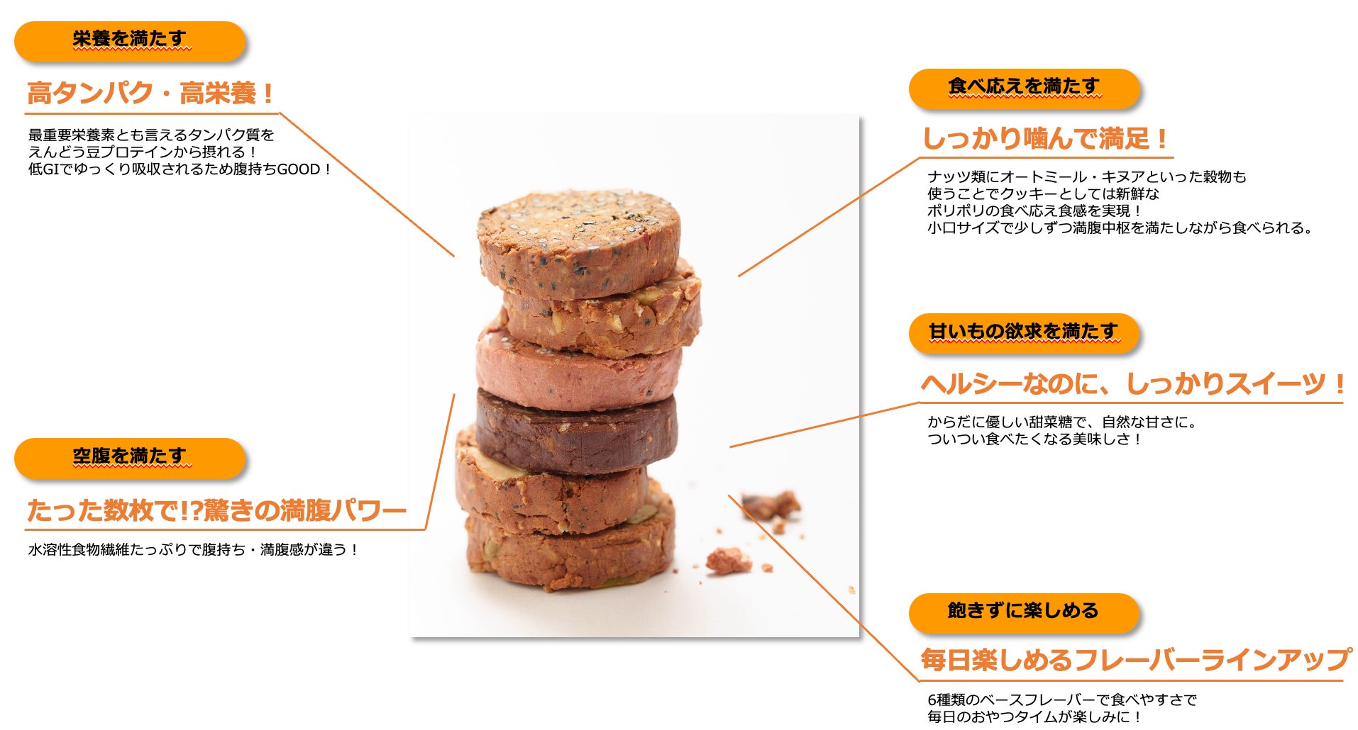 発酵工程を経たえんどう豆プロテインをベースに食物繊維や、オリゴ糖を含む甜菜糖、スーパーフード・キヌアなどからだにうれしい食材だけを使って、自社工房で丁寧に手作りで美味しく焼き上げています。
