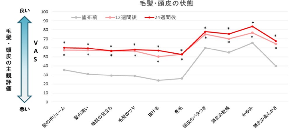 <結果グラフ②:毛髪と頭皮の主観的評価(VAS)> *p<0.05(VS. 塗布前)