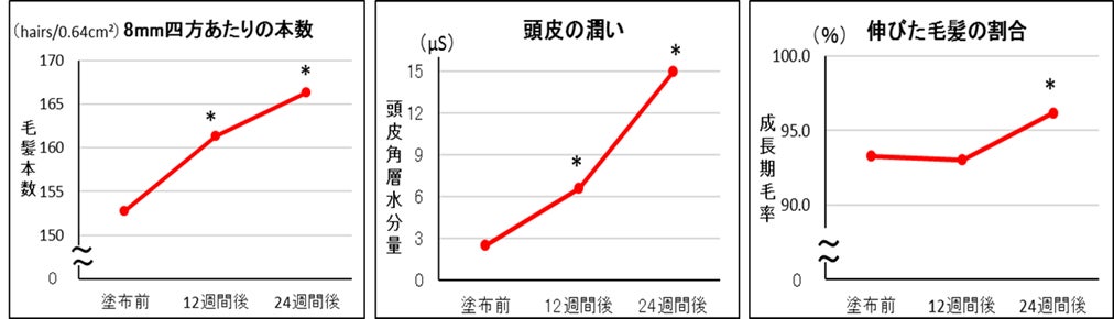 <結果グラフ①:毛髪本数及び頭皮角層水分量、成長期毛率の増加> *p<0.05(VS. 塗布前)