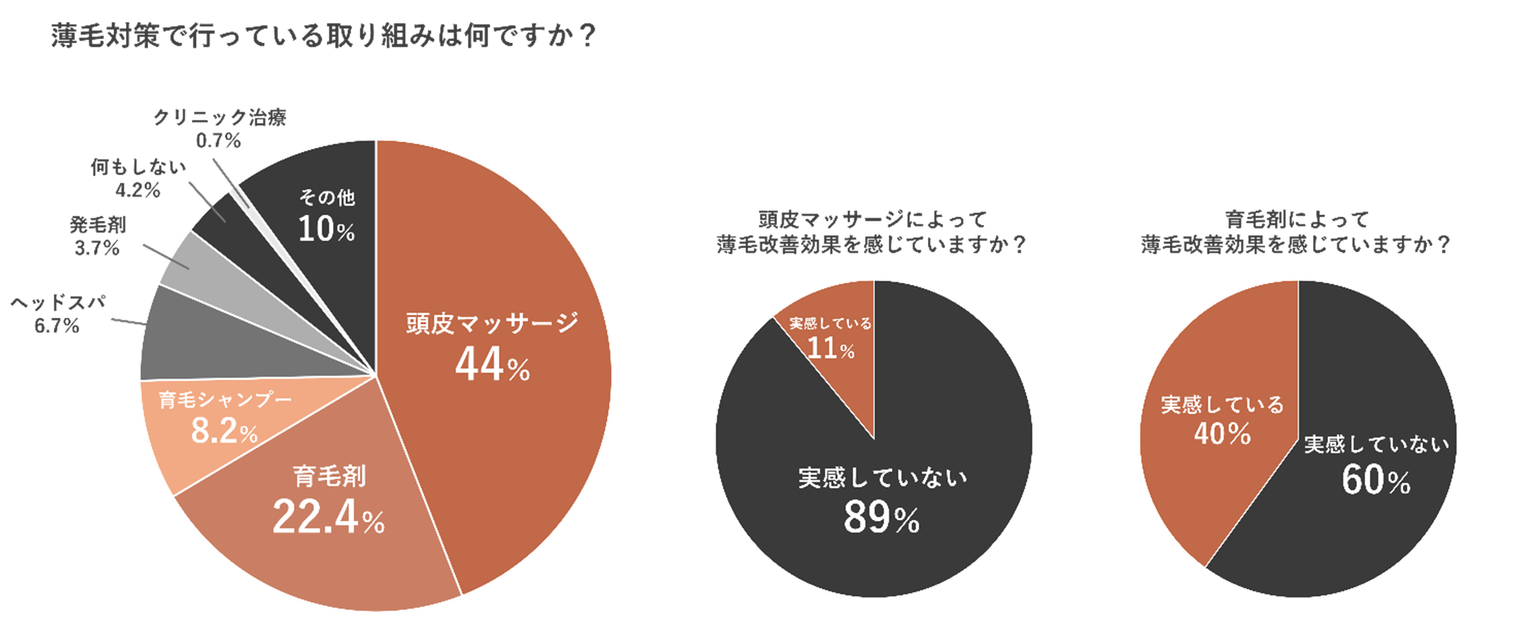 一方で、「現在実施している取り組みにより効果を実感していますか?」という質問をしたところ、前述の質問で「頭皮マッサージ」と回答した人のうち約9割が、「育毛剤」と回答した人のうち約6割の人が、「効果を実感できていない」と答えました。手軽さから自宅でできる薄毛対策が人気であることが浮き彫りとなった一方、そのような対策では満足に効果実感できず、物足りなさを感じている人が多いことが分かりました。
