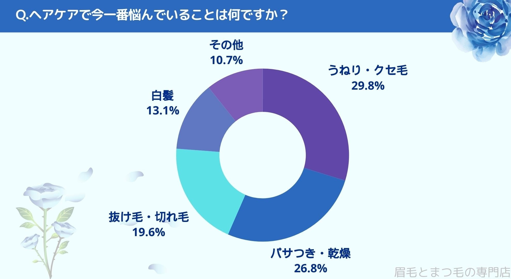 ヘアケアで今一番な悩んでいることをお聞きしたところ「うねり・クセ毛(29.8%)」、「パサつき・乾燥(26.8%)」、「抜け毛・切れ毛(19.6%)」、「白髪(13.1%)」、「その他(10.7%)」という結果になりました。