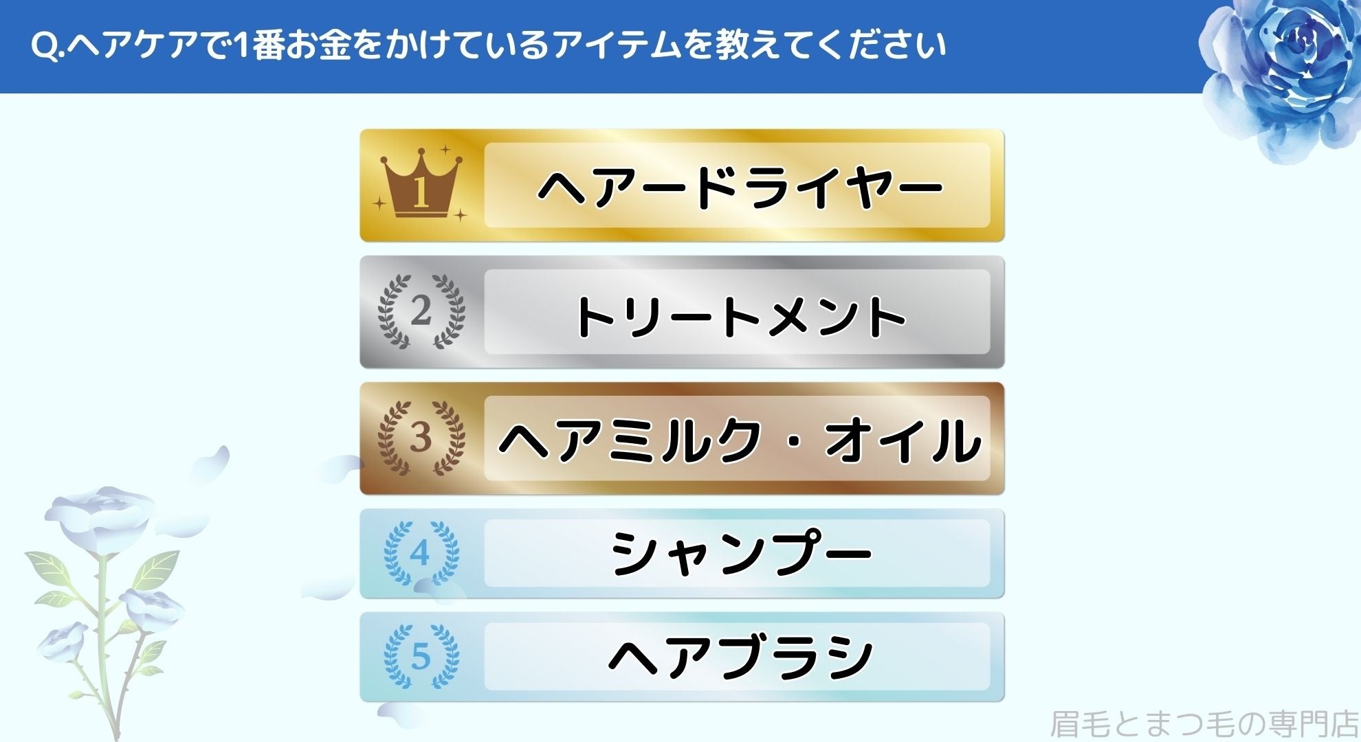 ヘアケアで1番お金をかけているアイテムをお聞きしたところ「1位>ヘアードライヤー」、「2位>トリートメント」、「3位>ヘアミルク・オイル」、「4位>シャンプー」、「5位>ヘアブラシ」という結果になりました。