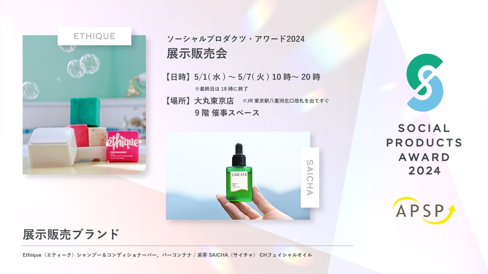 株式会社ピー・エス・インターナショナル(本社: 東京都港区、代表取締役会長兼社長兼CEO 浜口 直太)が展開する、静岡県の耕作放棄地からアップサイクルした「茶の実」の希少なオイルを使用したスキンケアブランド「采茶〜SAICHA(サイチャ)」、原料からパッケージに至るまでサステナブルなビューティーバーブランド「Ethique(エティーク)」は、2024年5月1日(水)~5月7日(火)に大丸東京店 9階 催事スペース(東京都千代田区、https://www.daimaru.co.jp/tokyo/ ) にて開催される「ソーシャルプロダクツ・アワード2024 展示販売会」に出展します。