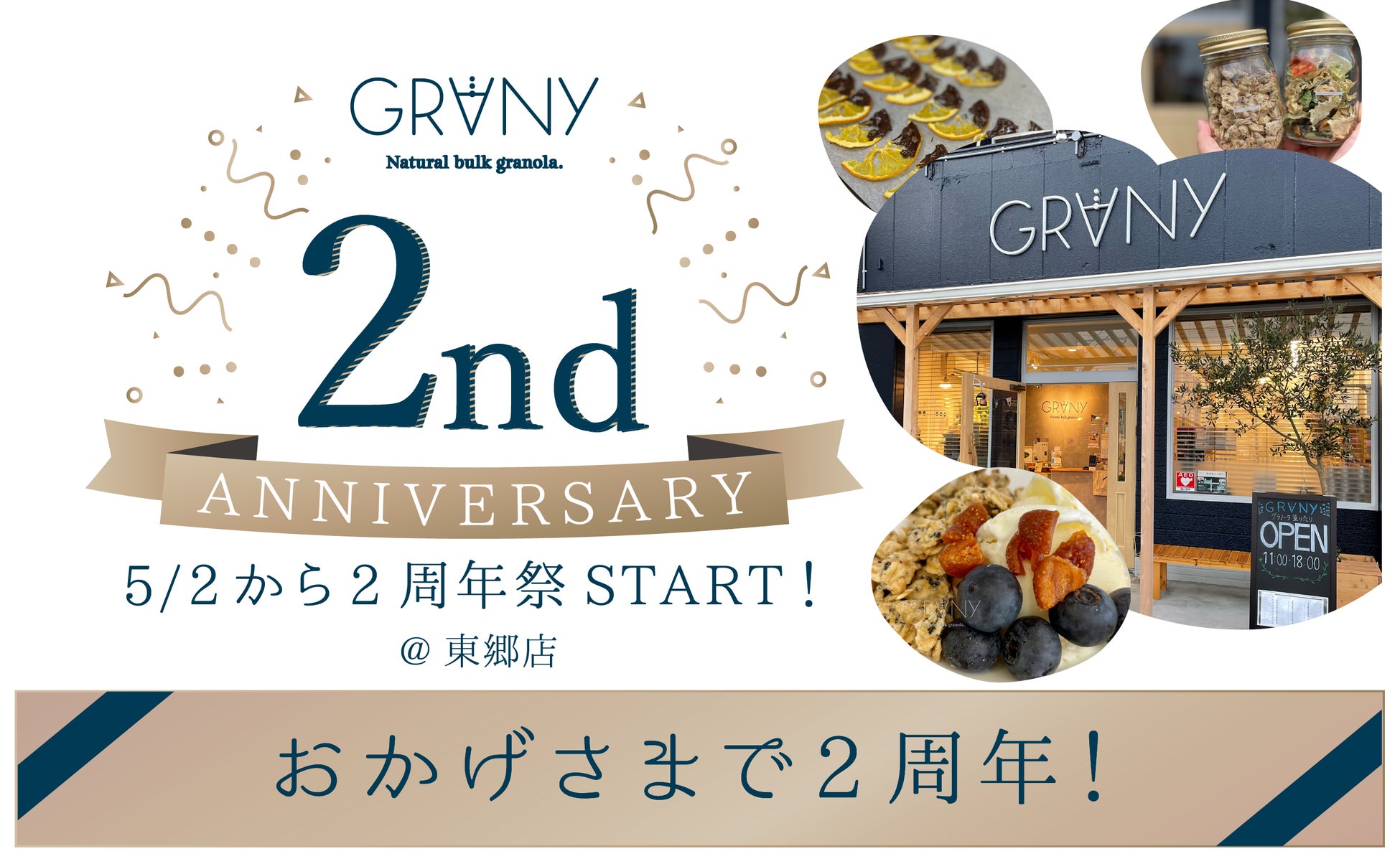 自然派グラノーラ専門バルクショップ【GRANY(グラニー)東郷店】は、皆様にご愛顧いただき2周年を迎えることとなりました。感謝の気持ちを込めまして「おかげさまで2周年祭」を開催します。