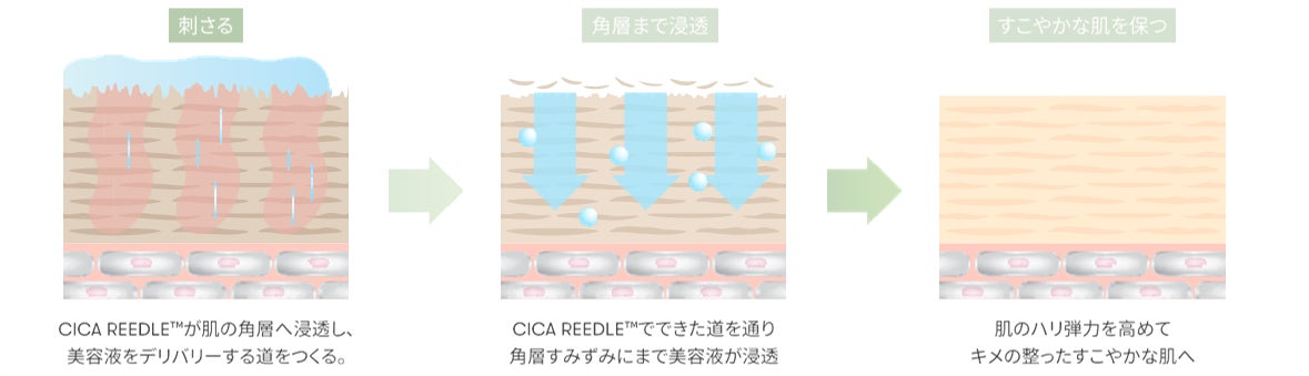 CICA REEDLE™が肌の角層へ浸透し、美容液をデリバリーする道をつくる。