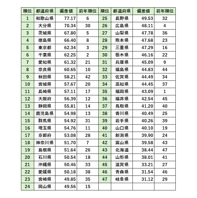 1位 和歌山県(前年6位)、2位 大分県(前年30位)、3位 茨城県(前年5位)