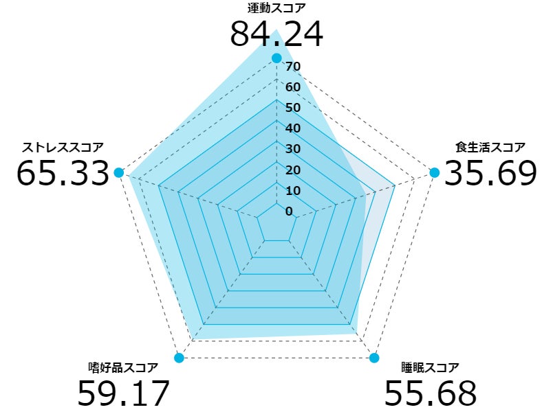 前年29位から大幅にスコアを落とし、全国最下位に転落。項目別でも全ての項目が全国平均を下回っており、特に食生活スコア、ストレススコアは全国最下位と低迷している。