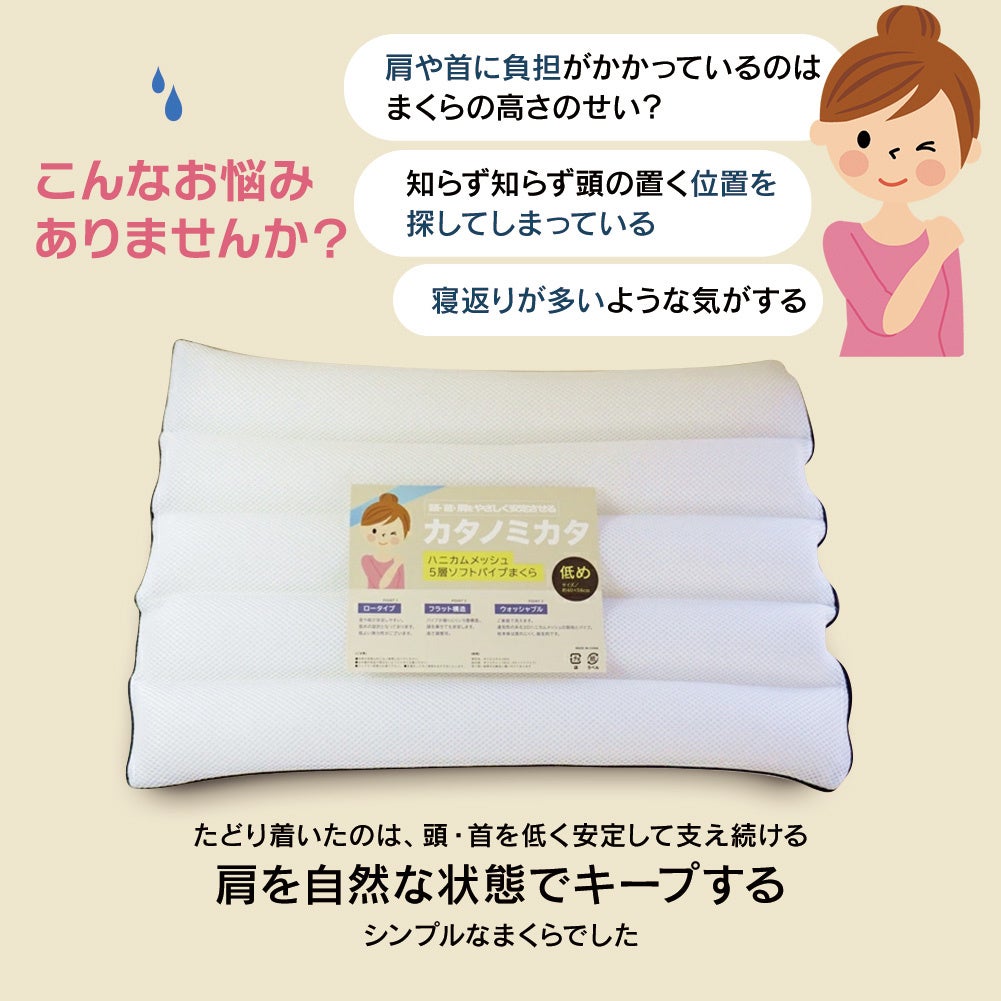 首・肩の負担を減らせる枕の形を追求し、硬さ、高さ、材質の開発を行ってきました。そして私自身で使い改良を加え続けること15年、理想の形をつくり上げることができました。私自身も肩・首の負担が減ったことと同時に寝返りも少なくなり、1日のスタートが気持ちよくきれるようになりました。この「カタノミカタ」が皆様にも長く愛用される枕になりますように。