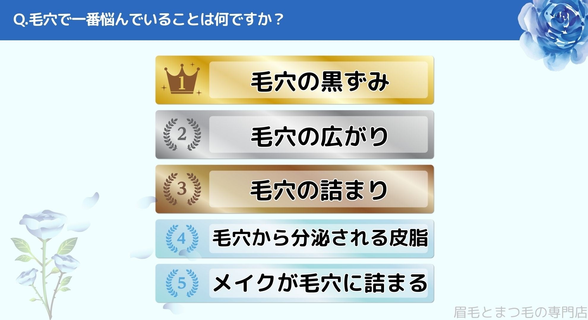 毛穴で一番悩んでいることをお聞きしたところ「1位>毛穴の黒ずみ」、「2位>毛穴の広がり」、「3位>毛穴の詰まり」、「4位>毛穴から分泌される皮脂」、「5位>メイクが毛穴に詰まる」という結果になりました。