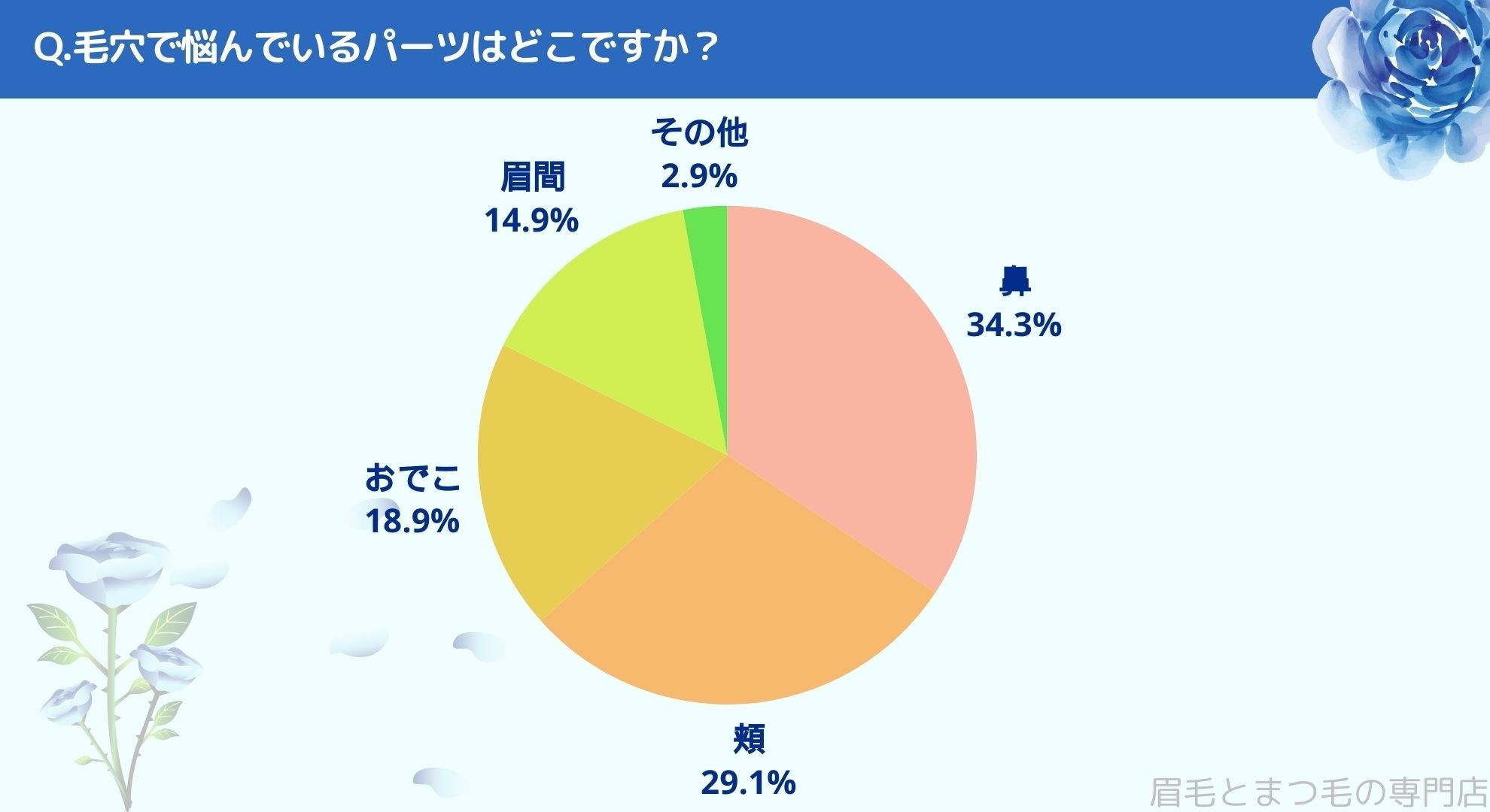 毛穴で悩んでいるパーツをお聞きしたところ「鼻(34.3%)」、「頬(29.1%)」、「おでこ(18.9%)」、「眉間(14.9%)」、「その他(2.9%)」という結果になりました。