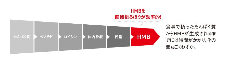 HMBは、このロイシンが分解された代謝物で、筋肉や肝臓などで作られ、日々活躍している貴重な成分です。体内での生成量が非常に少ないため、HMBを直接摂るほうが効率的とされています。