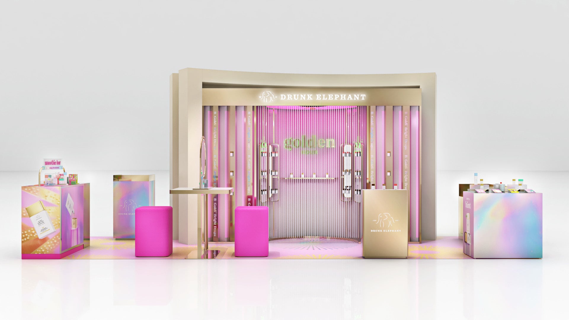 阪急うめだ本店 2階 プロモーションスペース21 にて、2024年5月15日(水)~5月21日(火)の期間限定で「ドランク エレファント Golden Hour in Osaka」の開催が決定。ゴールドに包まれたきらめく会場には、2023 年12月の発売以来人気の『ビーゴールディ ブライト ドロップス』が再入荷。その魅力を存分に体感できる、心ときめく時間をご提供いたします。ナイアシンアミド*¹を配合し、化粧下地や保湿セラムとしてはもちろんのこと、ハイライターとしてやボディへのツヤプラスなどマルチに使える、シャンパンゴールドがまばゆいカラーセラムをぜひお試しください。本イベントのテーマは”時間”。1日の時の流れを連想させる4つのブースが会場内に登場し、朝の準備や夕方のメイク直しなど、シーンにあわせたおすすめの使い方をご紹介いたします。この機会にお気に入りの使い方を見つけたら、あなただけの輝きをまとって心躍る1日を過ごして。