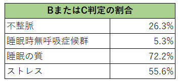 検査の結果がBまたはC判定だった人の割合は不整脈で26%、睡眠時無呼吸症候群で5%、睡眠の質で72%、ストレスで55%という結果でした。