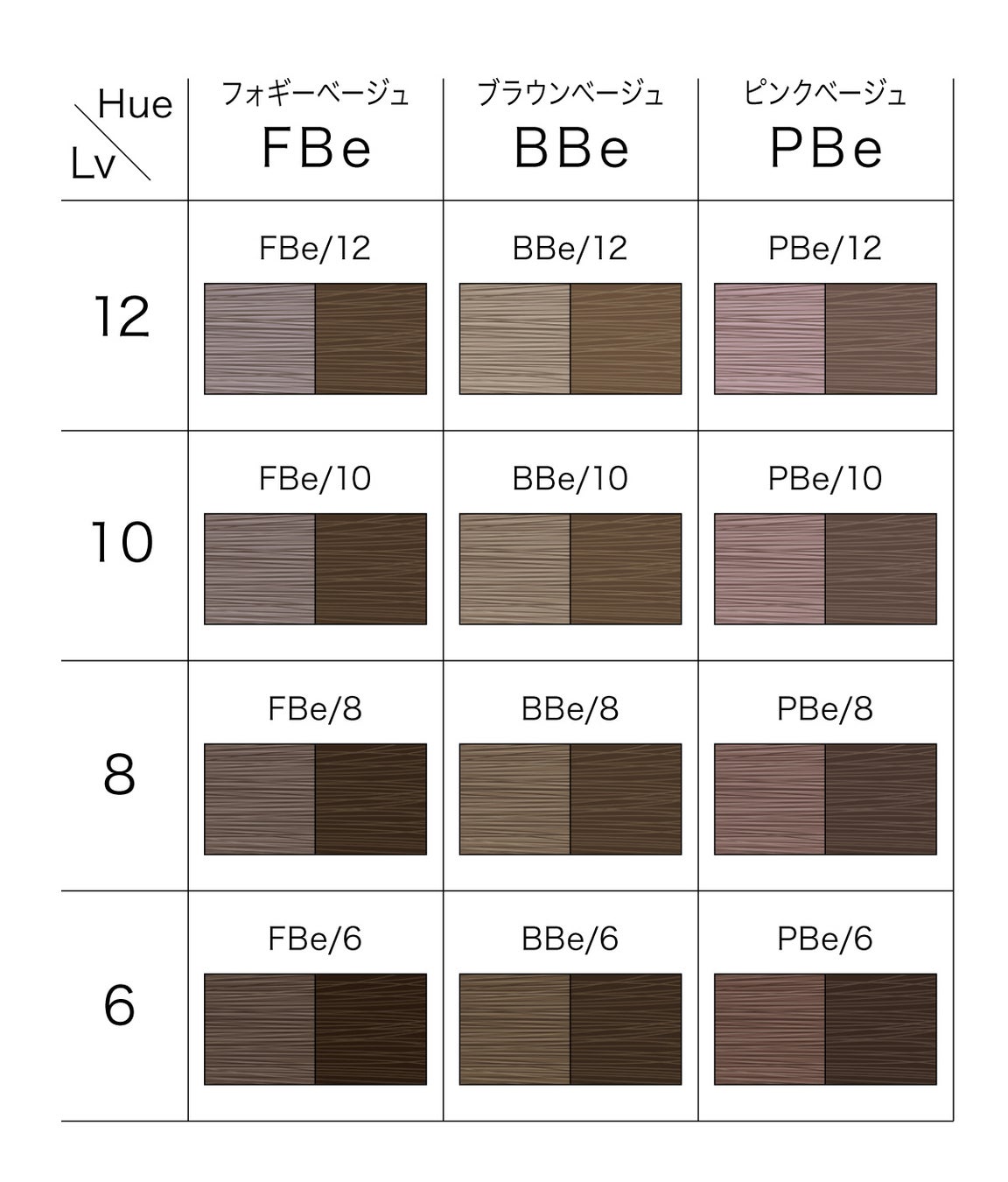FBe(フォギーベージュ)・BBe(ブラウンベージュ)・PBe(ピンクベージュ) 各6・8・10・12Lv