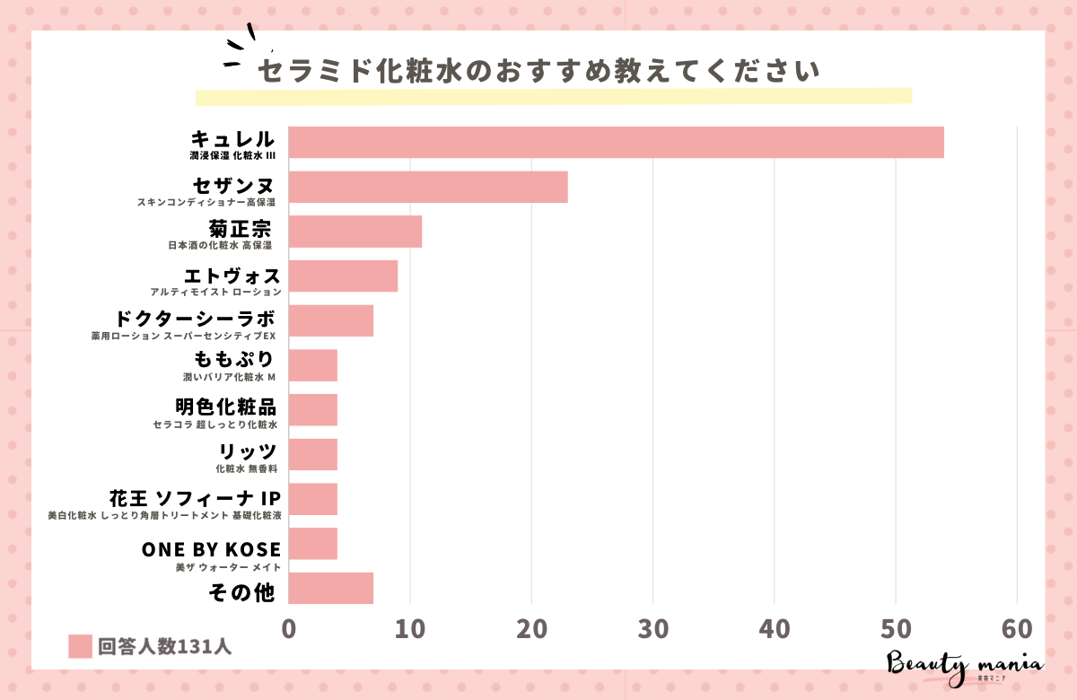 株式会社Sheer(https://b-sheer.co.jp/)が運営するベストコスメを中心とした美容レビューメディア「美容マニア」(https://b-sheer.co.jp/biyo-mania/)は、20歳以上の美容に興味のある131人に「セラミド化粧水のおすすめ教えてください」についてのアンケート調査を実施。