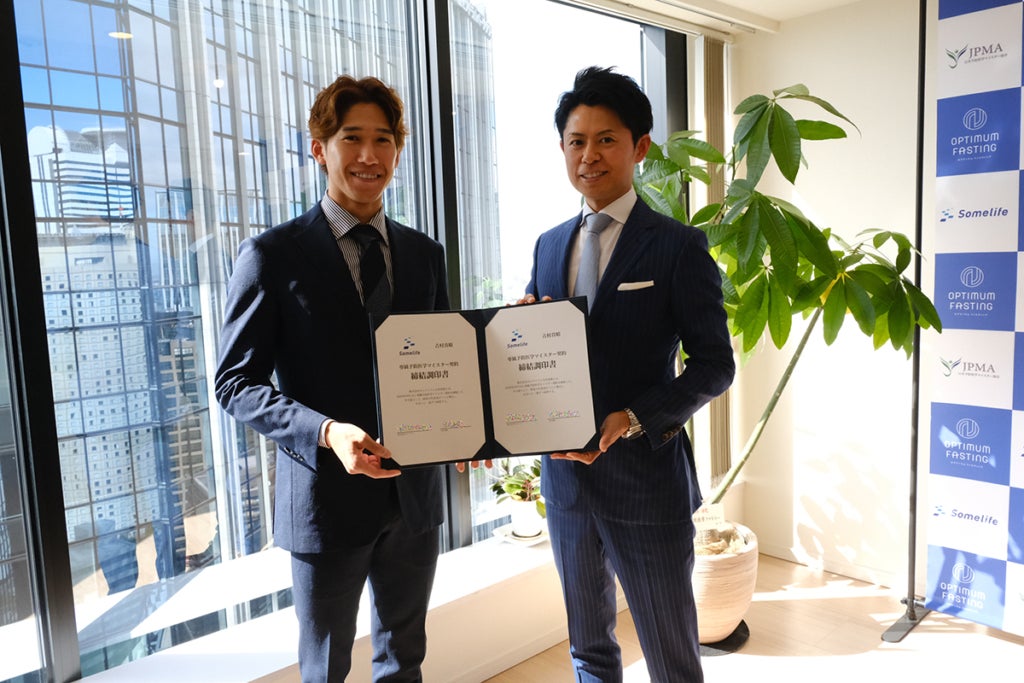 リオ五輪銀メダリスト(卓球の男子団体) の吉村真晴選手 (株式会社SCOグループ) と株式会社サムライフ 代表取締役 坂田武士とで、「専属予防医学マイスター契約」の調印式が行われました。