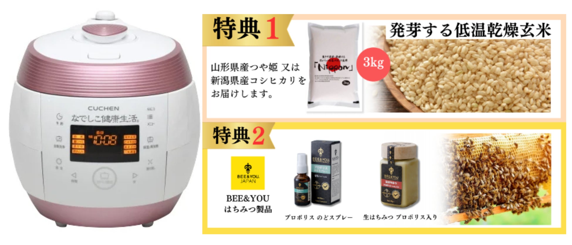【事業内容】:玄米発芽機能付 全自動炊飯器『なでしこ健康生活®』の販売、セルフケアECサイト『ヘルスリテ』の運営、家庭用医療機器等の販売、高品質健康 生はちみつ・プロポリス『BEE&YOU』の独占販売