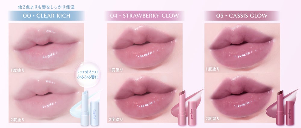 <00>クリアリッチは、他2色よりも唇をしっかりと保湿してくれるリッチ処方で、よりぷるむち唇に。