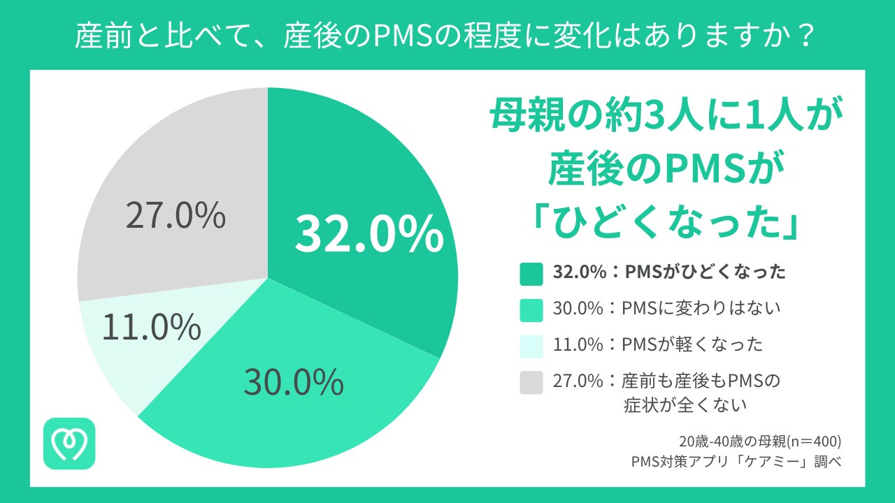 20歳から40歳の母親400人に対し、産後のPMSに変化があったか尋ねたところ、32.0%が「ひどくなった」と回答しました。