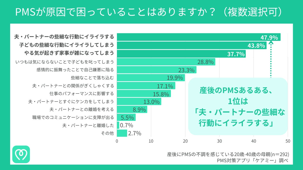 産後にPMSの不調を感じている人に、「PMSが原因で困っていること」について尋ねたところ、最も多かったのは、「夫・パートナーの些細な行動にイライラする」という回答で47.9%でした。次いで、「子どもの些細な行動にイライラしてしまう」が43.8%、「やる気が起きず家事が雑になってしまう」が37.7%という結果でした。また、感情的に振舞ったことで自己嫌悪に陥る人や、夫とギクシャクしたり、離婚を考えてしまう人がいることも分かりました。