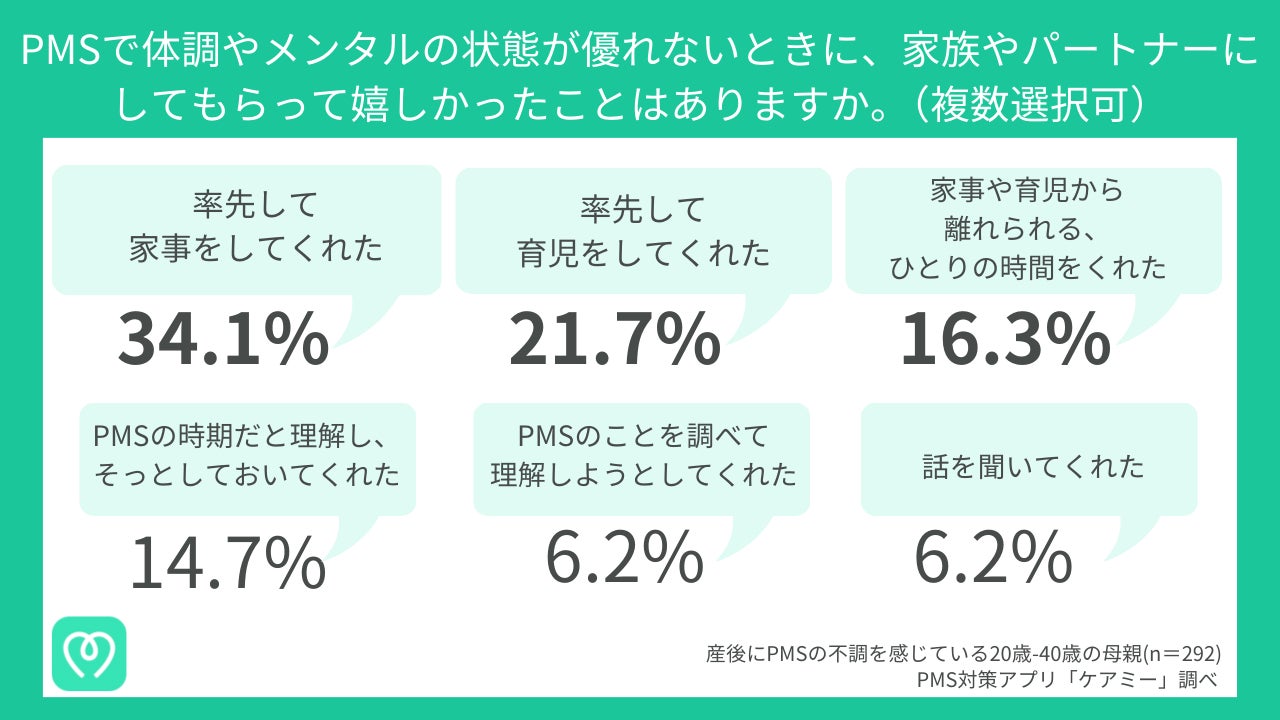 産後にPMSによる不調を感じている人に、「PMSで体調やメンタルの状態が優れないときに、家族やパートナーにしてもらって嬉しかったこと」について尋ねたところ、最も多かったのは、「率先して家事をしてくれた」という回答で34.1%、次いで「率先して育児をしてくれた」が21.7%、「家事や育児から離れられる、ひとりの時間をくれた」が16.3%という結果となりました。その他、「そっとしておいてくれた」、「理解しようとしてくれた」、「話を聞いてくれた」といった対応が嬉しかったという声もありました。それぞれ、具体的なエピソードと一緒にご紹介します。