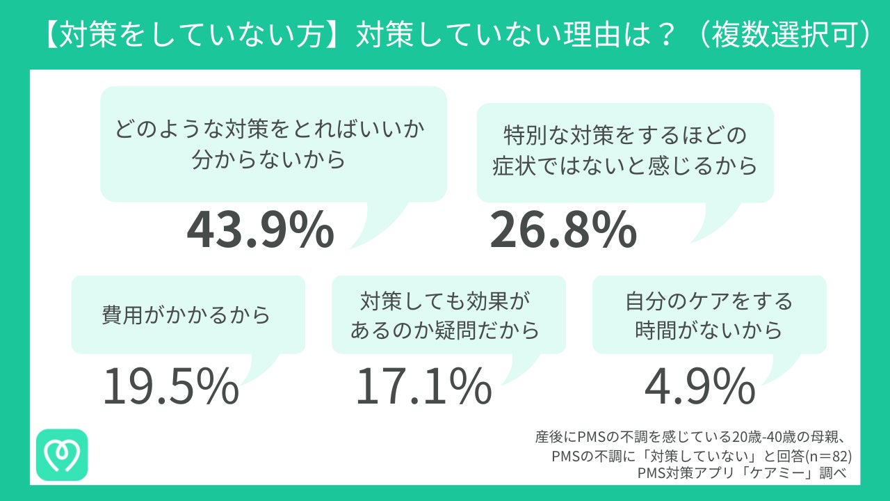 PMSの不調に「対策していない」と答えた人に対し、その理由を聞きました。最も多かったのは、「どのような対策をとればいいか分からない」という回答で、43.9%となりました。次いで、「特別な対策をするほどの症状ではないと感じるから」が26.8%、「費用がかかる」が19.5%でした。