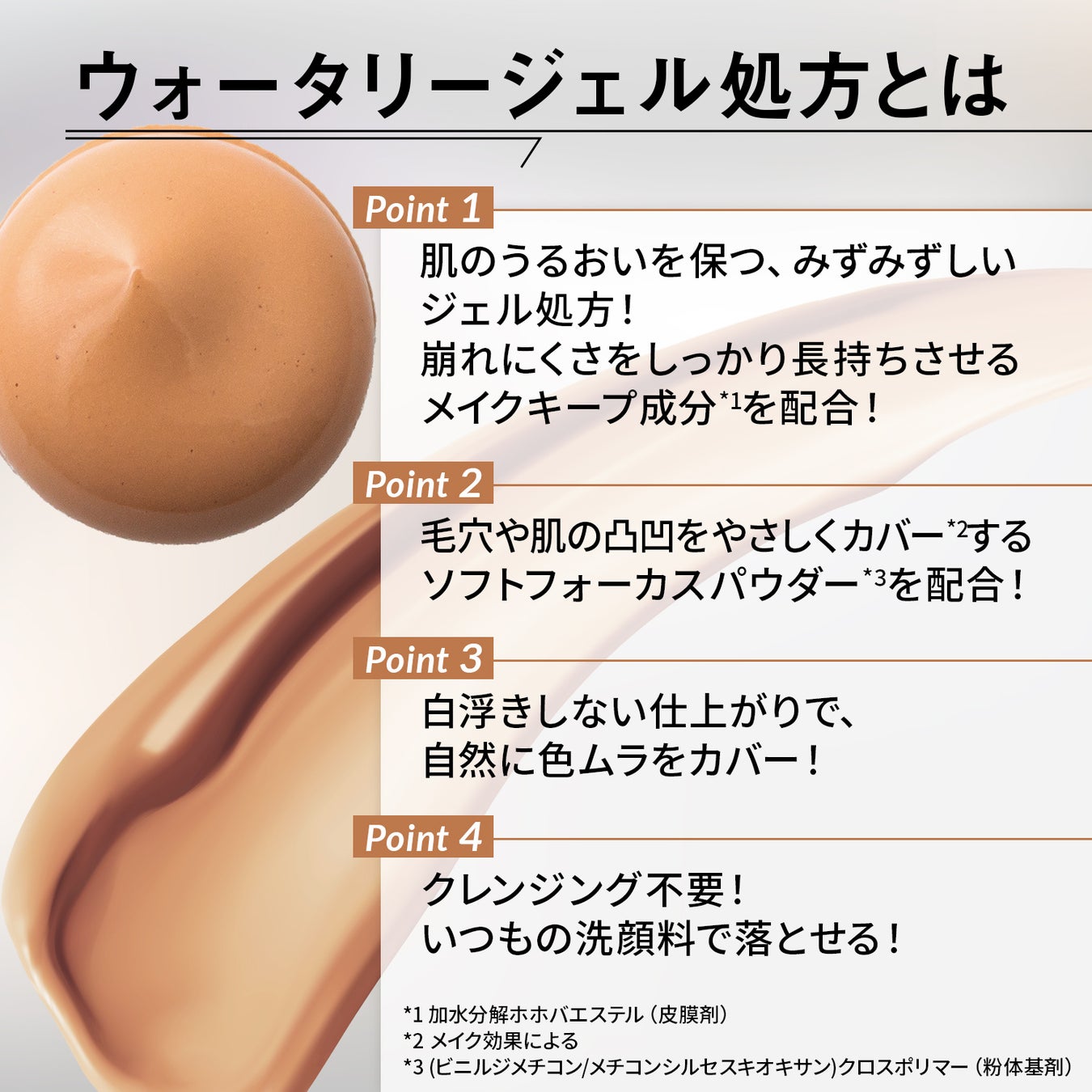 ・肌の潤いを保つ、みずみずしいジェル処方!崩れにくさをしっかり長持ちさせるメイクキープ成分*¹を配合!