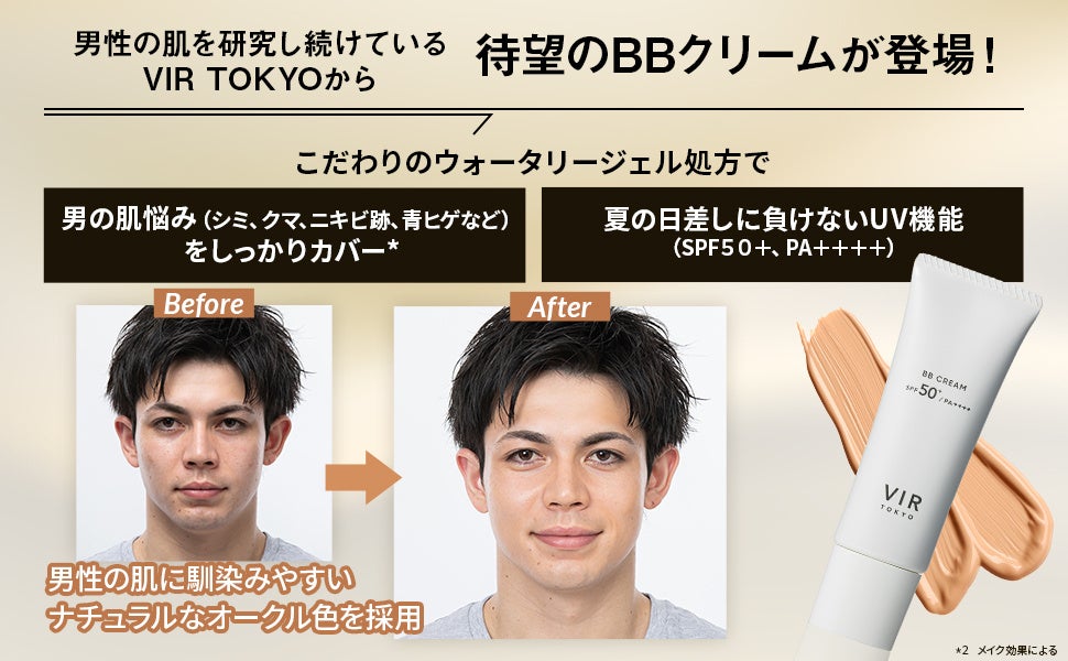 VIR TOKYOは男性の肌悩みに適したスキンケア商品をはじめとした商品開発を行ってきました。今回新たに誕生した『VIR TOKYO BB CREAM』は、男性の肌悩み(シミ、クマ、ニキビ跡、青ヒゲ、毛穴)をこだわりのウォータリージェル処方でしっかりカバー出来るBBクリームです。