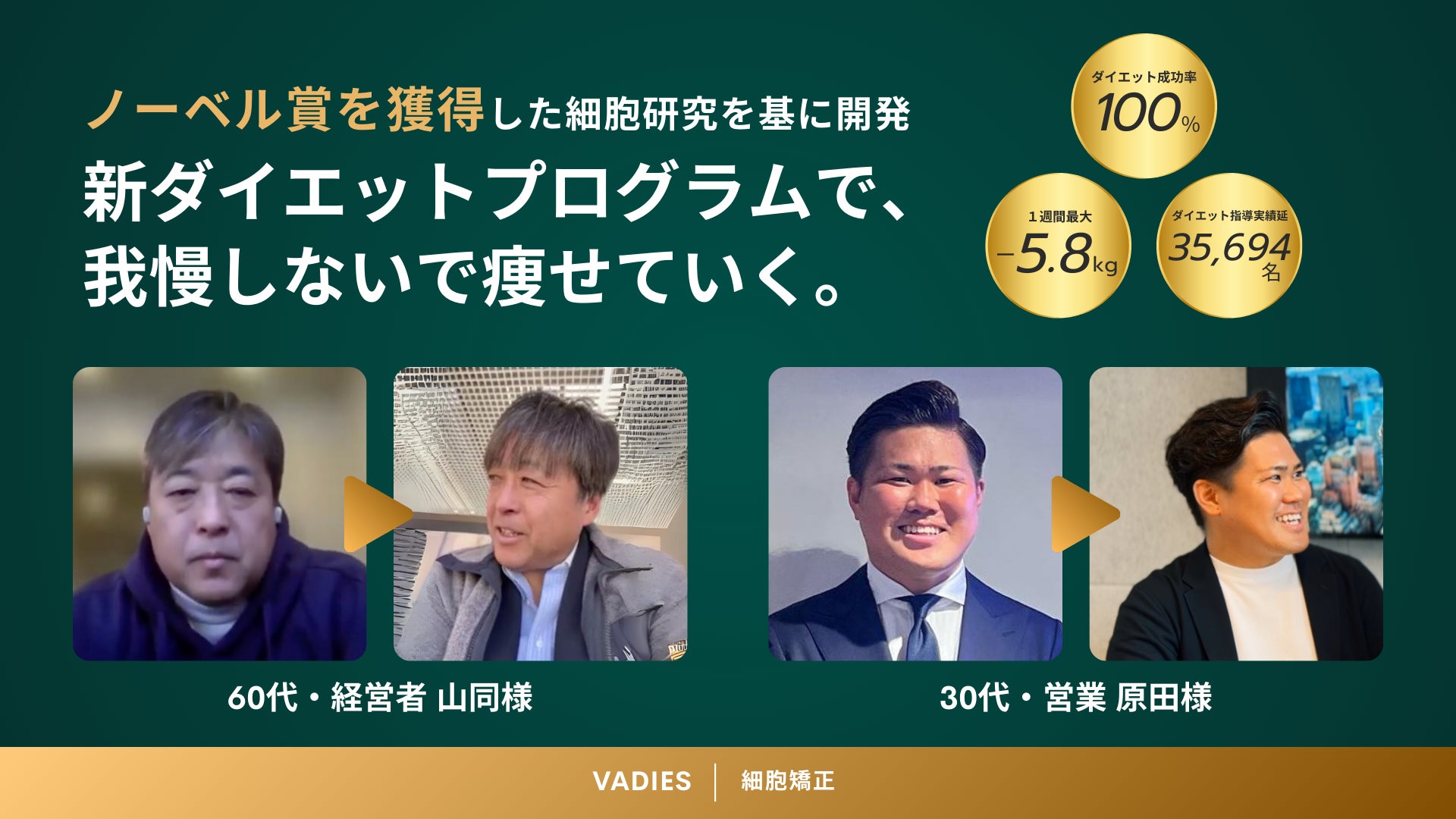 ノーベル賞を獲得した細胞研究を基に、6年8ヶ月の期間と延3万名を超える被験者によって開発した科学的アプローチで、「ジムに通わず」「食事制限なし」で、秘書があなたの24時間のヘルスケアをサポートする新ダイエットサービスです。1週間(=168時間)に2回しか通わない従来のパーソナルトレーニングでは、生活習慣の改善に及ぼす影響はたった約1%しかありません。VADIESは「24時間のヘルスケア・コーチング」という考え方に基づき、24時間の運動、睡眠、食事、水分、温活、柔軟をデバイスで管理し、秘書が「挫折しない」ためのパーソナルコーチングを行います。