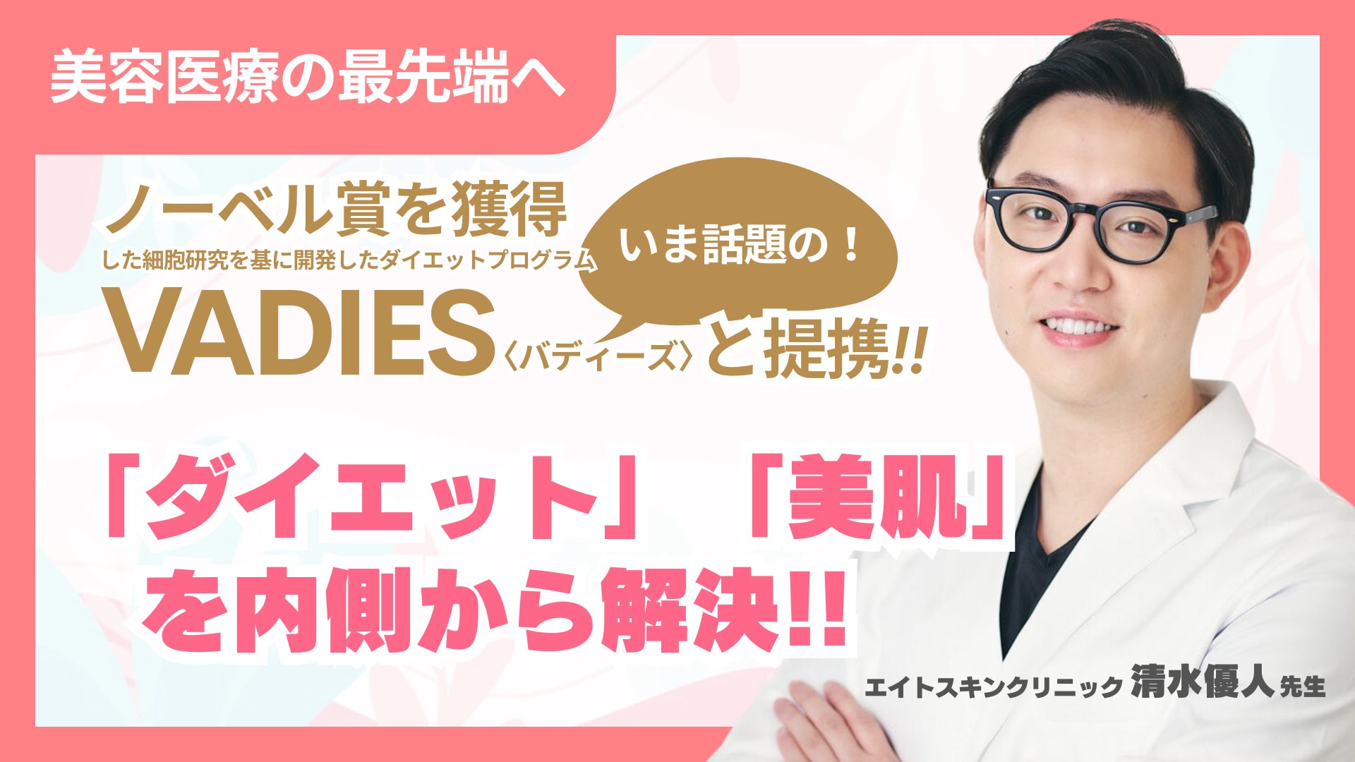Eight Skin ClinicがVADIESと提携することで、外科的な美容のみならず、運動や睡眠や食事による生活習慣を改善することでダイエット、美肌効果、意欲向上などのインナービューティといった「美」をトータルサポートすることが可能となりました。