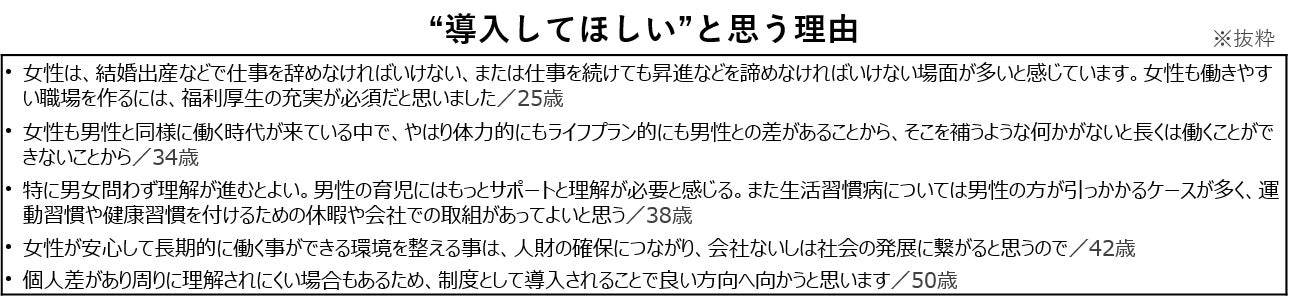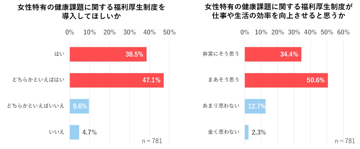 導入率の低さに対して、導入してほしいかという質問については、「はい/どちらかといえばはい」が85.6%と高い結果となりました。また、導入することによって仕事や生活の効率があがると思うかという質問についても、「非常にそう思う/まあそう思う」が85%となり、働く女性たちはよりよい環境で仕事や日々の生活を送るためにも女性特有の健康課題に関する福利厚生制度を求めていることが明らかになりました。
