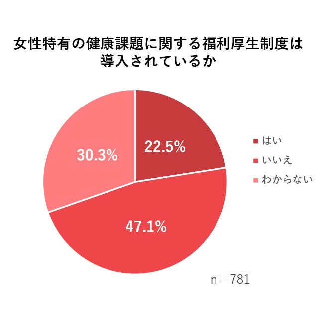 勤めている会社で女性特有の健康課題に関する福利厚生制度が導入されているか質問したところ、導入率は22.5%という結果となり、さまざまな商品・サービスは増えているものの導入率はまだ低いことがわかりました。