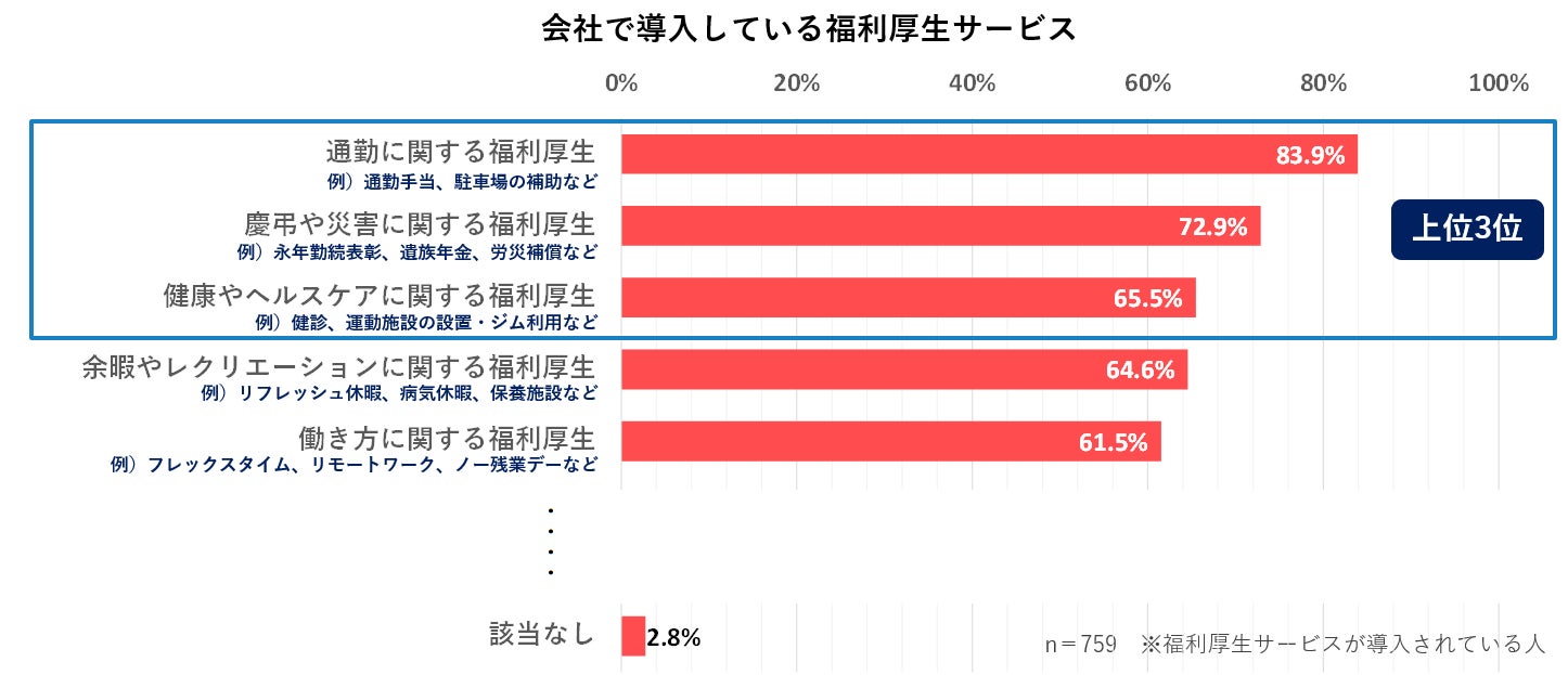 会社で導入されている福利厚生サービスの種類は、導入率上位から順に「通勤に関する福利厚生(通勤手当、駐車場補助など)」が83.9%、「慶弔や災害に関する福利厚生(永年勤続表彰、遺族年金、労災補償など)」が72.9%、「健康やヘルスケアに関する福利厚生(健診、運動施設の設置・ジム利用など)」が65.5%という結果となりました。