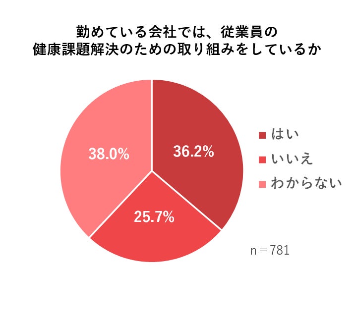 健康経営優良法人認定など、会社が従業員の健康課題解決の取り組みをしているかという質問に対して、「はい」と回答したのは36.2%で、具体的にどんな取り組みをしているのか聞いたところ、「健康経営優良法人認定」、「健康認定ホワイト500」、「健康企業宣言」など国や各協会が認定している取り組みのほか、「アプリによる健康管理」、「健康に関するイベント、産業医による講習会開催」、「スポーツジムなどの割引制度」などが挙がりました。