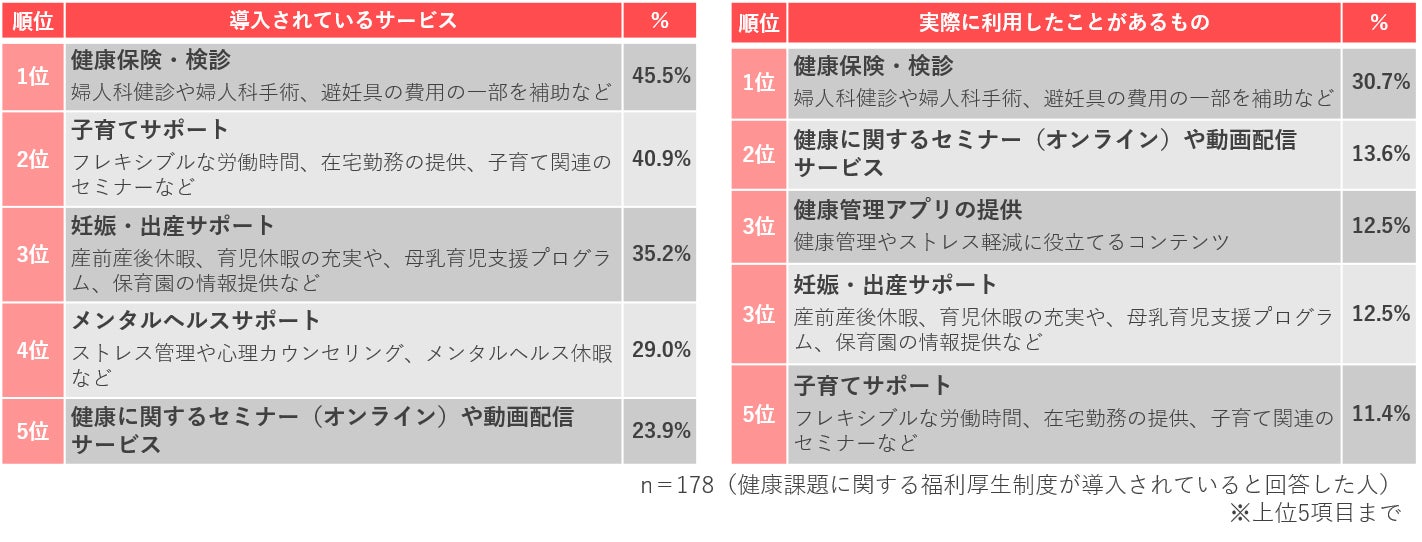 また「導入されている」と回答した人に対して、導入されている具体的なサービスを質問したところ、「健康保険・検診」が45.5%、続いて「子育てサポート」40.9%、妊娠・出産サポート35.2%という結果となりました。実際に利用したことがあるサービスとしても1位は「健康保険・検診」で3割の人が利用した経験があるものの、2位以下は「健康に関するセミナー(オンライン)や動画配信サービス」13.6%、「健康管理アプリの提供」12.5%と、全体的に利用率が低いことも明らかになりました。