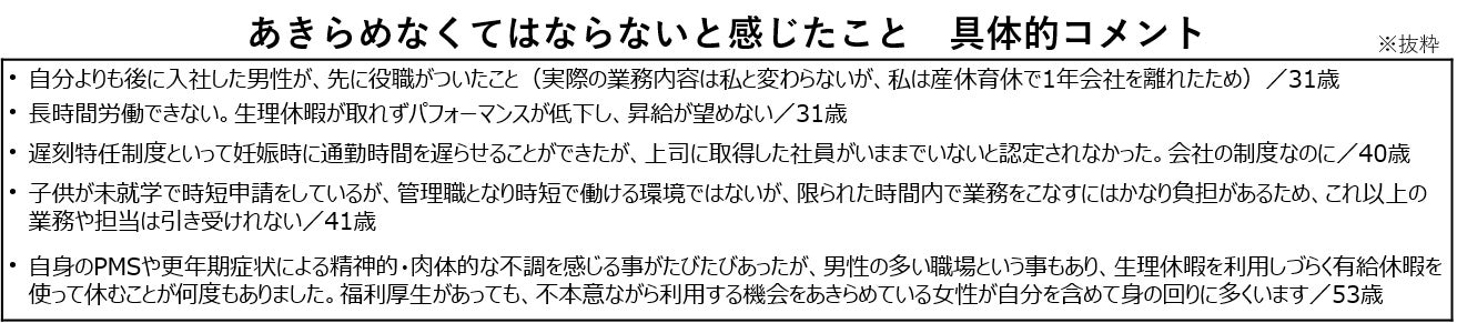 具体的にどんなことをあきらめたのかフリーアンサーで回答してもらったところ下記のようなコメントが集まり、主な要因としては、①家庭の変化によるキャリアへの影響 ②健康問題によるキャリアへの影響 ③職場環境や制度の影響 ④社会的な圧力や不平等な評価 があることがわかりました。