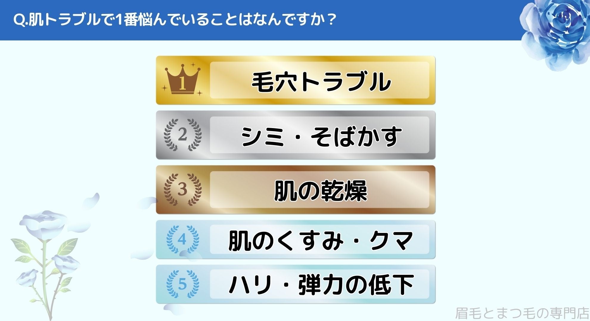肌トラブルで1番悩んでいることをお聞きしたところ「1位>毛穴トラブル」、「2位>シミ・そばかす」「3位>肌の乾燥」、「4位>肌のくすみ・クマ」、「5位>ハリ・弾力の低下」という結果になりました。