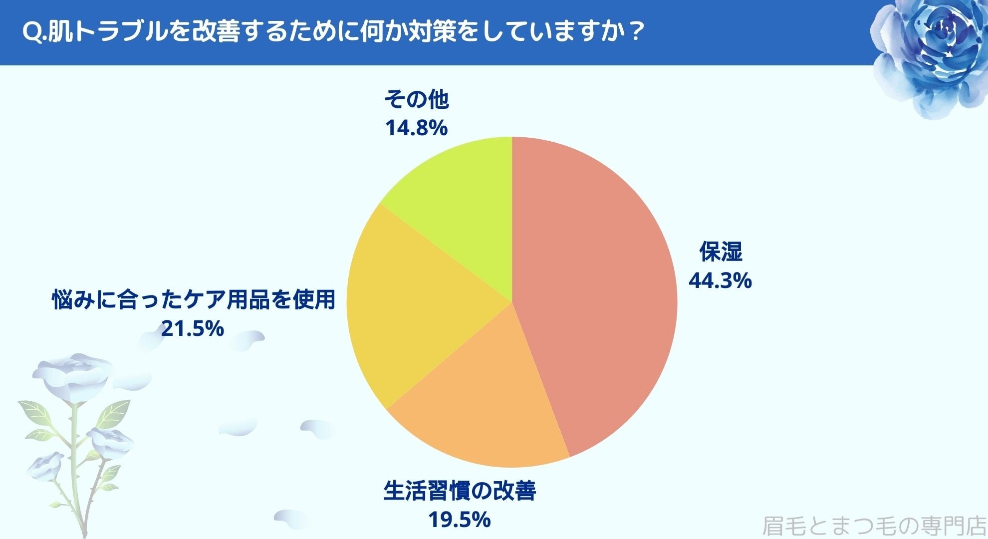 肌トラブルを改善するための対策をお聞きしたところ「保湿(44.3%)」、「生活習慣の改善(19.5%)」、「悩みにあったケア用品を使用(21.5%)」、「その他(14.8%)」という結果になりました。