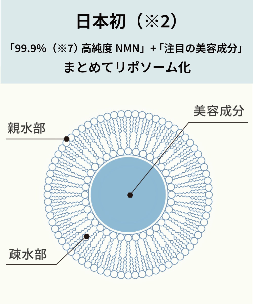 『99.9%(※7)高純度NMN』と『注目の美容成分』を、人の肌と親和性が高い、リン脂質でできた何層にもなるカプセルの中に閉じ込め、お肌のすみずみ(※6)へ確実に届ける技術「リポソーム」を採用。リポソーム化することで、一部の劣化しやすい美容成分を、配合したての新鮮な状態でお肌のすみずみまで浸透(※6)させることが可能になり、より成分の魅力をご体感いただけるようになります。