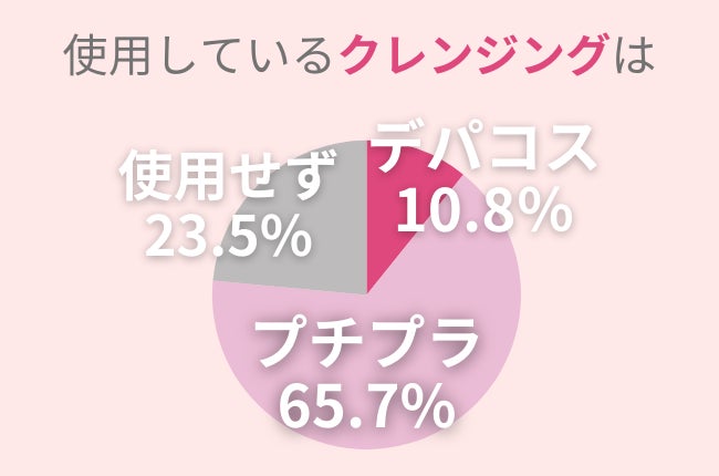 調査の結果、クレンジングについて、デパコスを使用している方が10.8%、プチプラを使用している方が65.7%であることがわかりました。