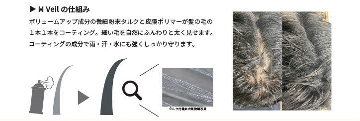 「M Veil」は黒色に着色した微細粉末タルクと皮膜ポリマーを噴霧することで、髪の毛1本1本を太く見せ、白髪をカバーすることができる。