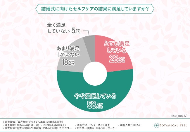 「結婚式に向けたセルフケアの結果に満足していますか?」と質問したところ、『とても満足している( 23.3%)』『やや満足している(53.4%)』『あまり満足していない(18.2%)』『全く満足していない(5.1%)』という回答結果になりました。