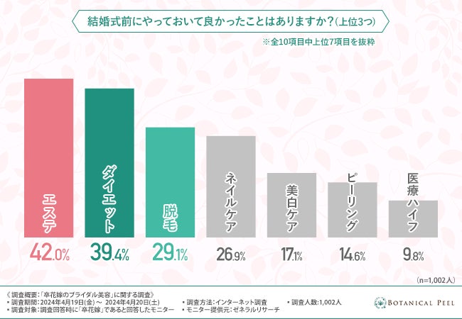 「結婚式前にやっておいて良かったことはありますか?(上位3つ)」と質問したところ、『エステ(42.0%)』と回答した方が最も多く、次いで『ダイエット(39.4%)』『脱毛(29.1%)』と続きました。