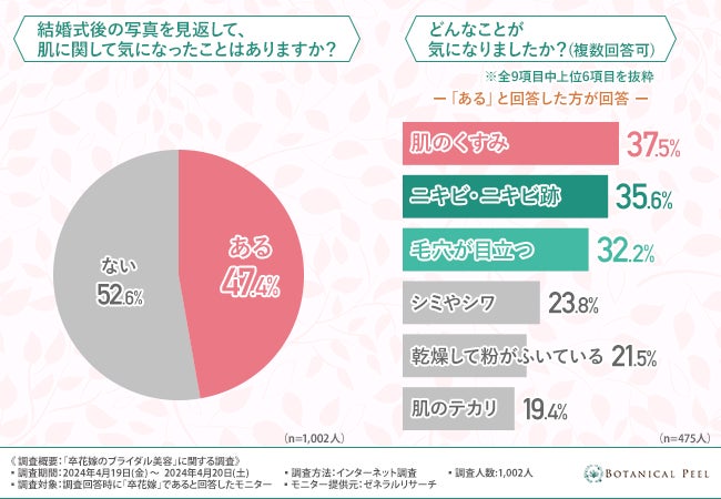 「結婚式後の写真を見返して、肌に関して気になったことはありますか?」と質問したところ、約半数の方が『ある(47.4%)』と回答しました。