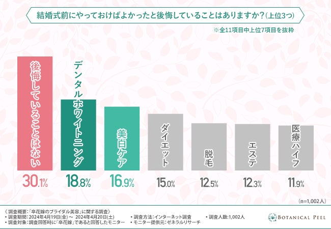 次に、「結婚式前にやっておけばよかったと後悔していることはありますか?(上位3つ)」と質問したところ、『後悔していることはない(30.1%)』と回答した方が最も多く、次いで『デンタルホワイトニング(18.8%)』『美白ケア(16.9%)』と続きました。