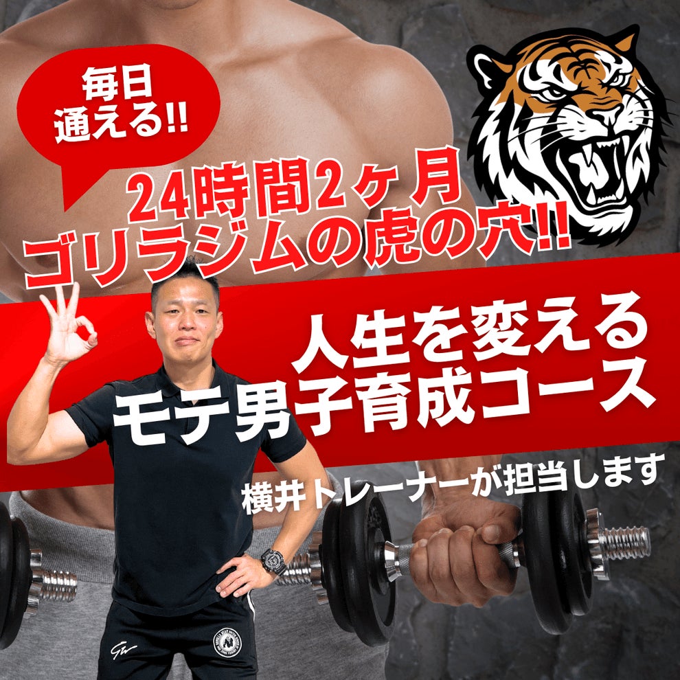 「モテ男子育成コース~虎の穴~」は、トレーナー歴20年を数えるボディメイクのエキスパートが一人前のモテ男子を育てるコースです。ジムは2ヶ月間、24時間好きな時間に利用でき、一人ひとりの目標に合わせてカスタマイズされたトレーニングプランにより、理想の体型と確かな自信を手に入れていただくことを目的としています。