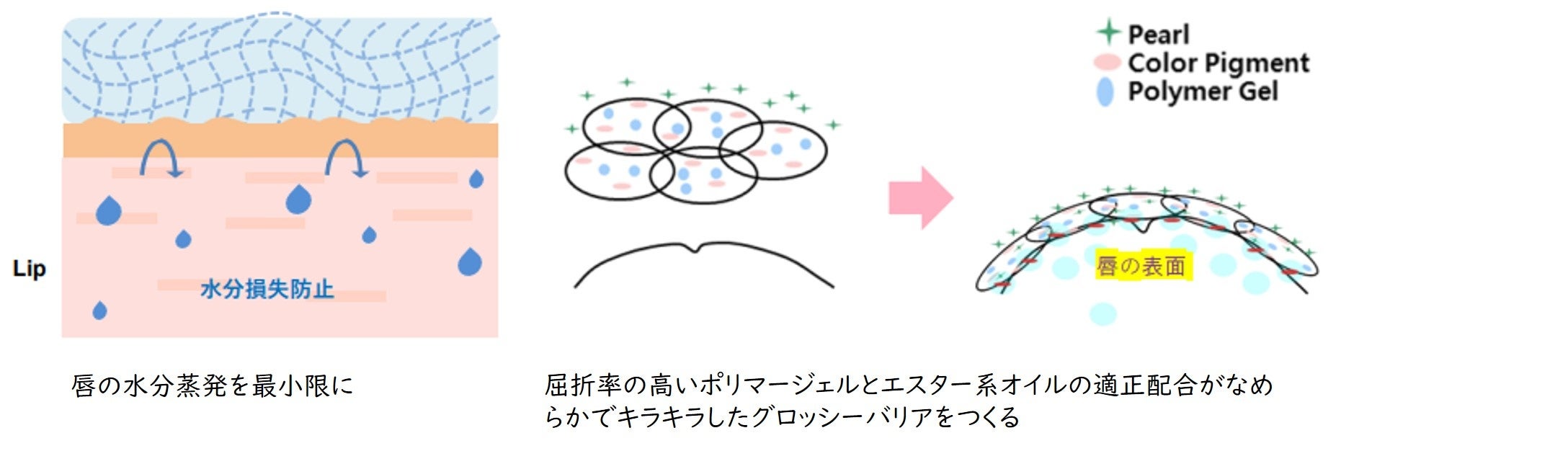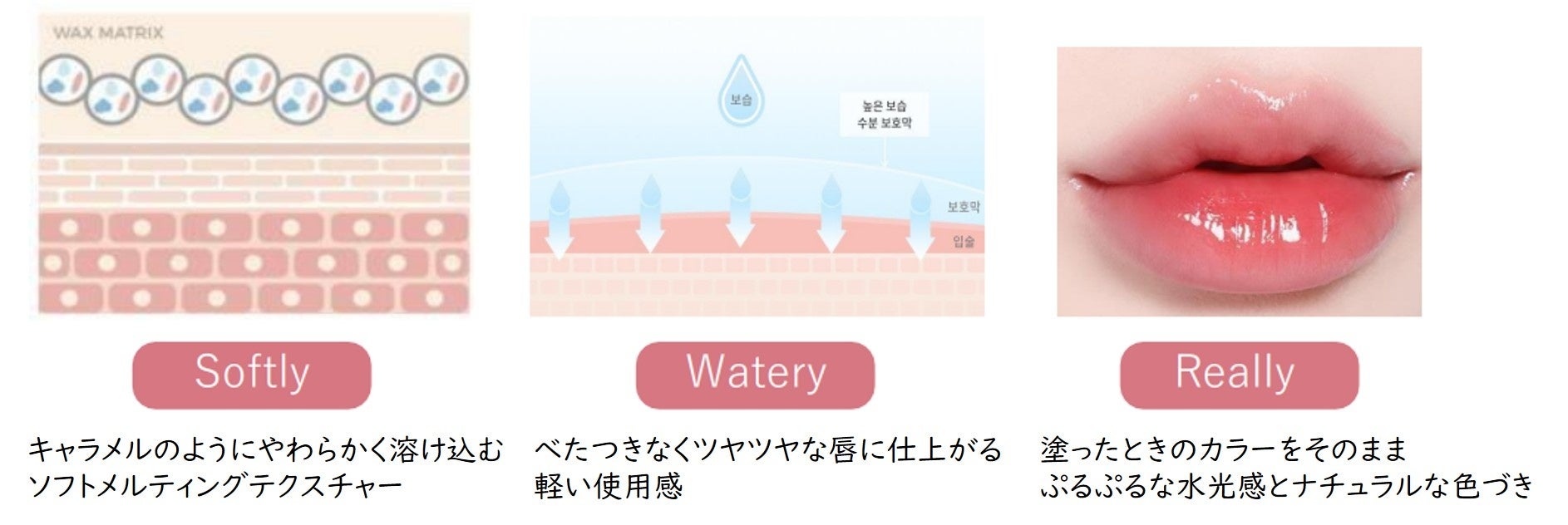 水分の蒸発を防ぎ、早い変化を誘導する技術で、ガラスように澄んだ光沢のあるオイル膜が唇の上をキープし、自然な着色と色落ちの少ないツヤ感を演出します。