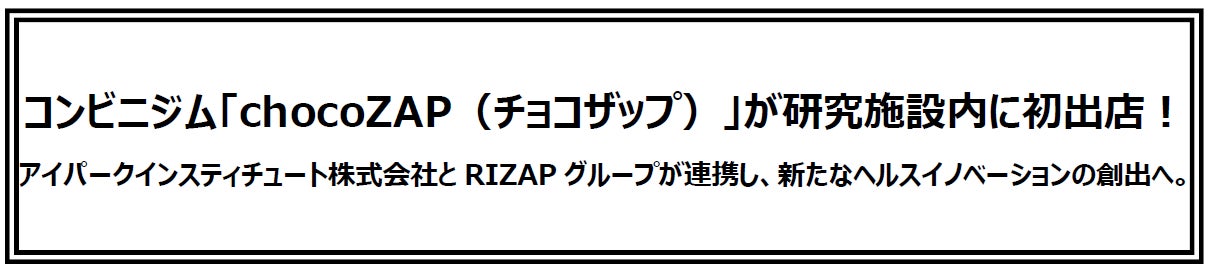 RIZAPグループ株式会社(代表取締役社長 瀬戸 健、本社:東京都新宿区)とその連結子会社である RIZAP株式会社が運営するコンビニジム「chocoZAP(チョコザップ)」は、アイパークインスティチュート株式会社(代表取締役社長 藤本 利夫、本社:神奈川県藤沢市)が運営する湘南ヘルスイノベーションパーク(以下、湘南アイパーク)と連携し、chocoZAPを活用した新たなヘルスイノベーションの創出へ向け、研究施設内に初めてchocoZAPを出店いたします。
