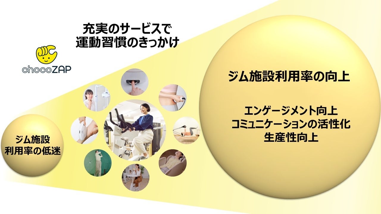 chocoZAPにおいて、トレーニングをはじめとしRIZAPトレーナーがこれまで培ってきた知見やノウハウの共有など、多彩なサービスを提供することで、ジムに通うモチベーションの向上と継続利用を促します。また、利用者がリフレッシュを通じて生産性を高め、最高のパフォーマンスでライフサイエンスに従事できる環境を構築します。
