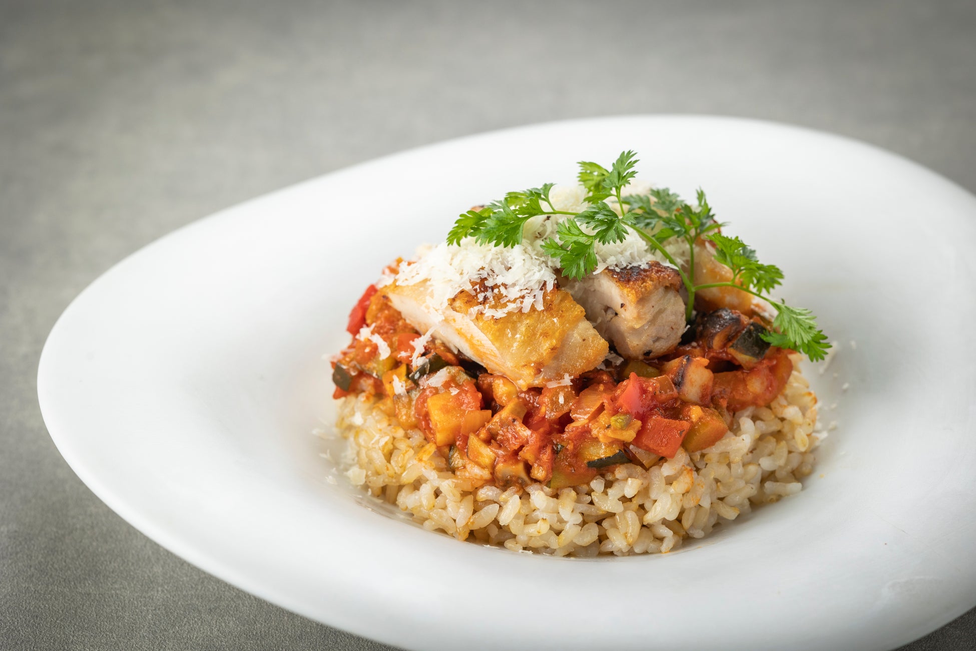 ・特長:野菜のうまみをたっぷり凝縮したカポナータは、プチプチ食感の玄米との相性抜群。